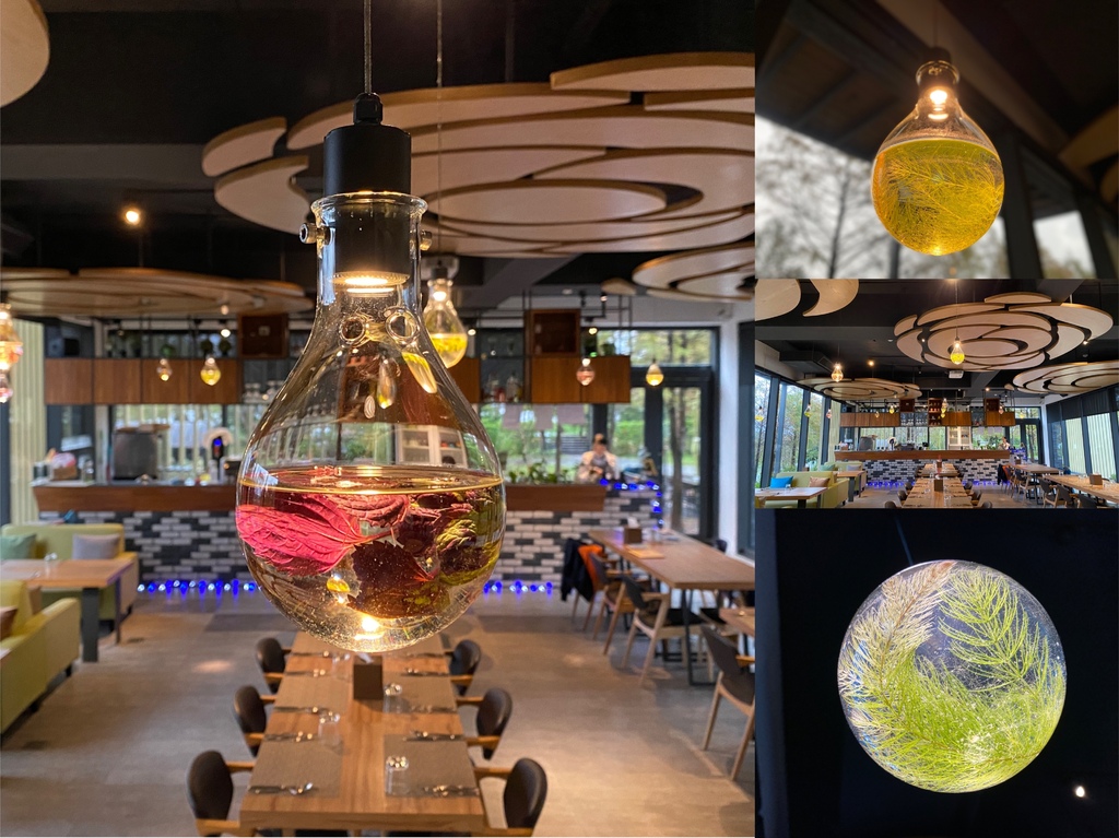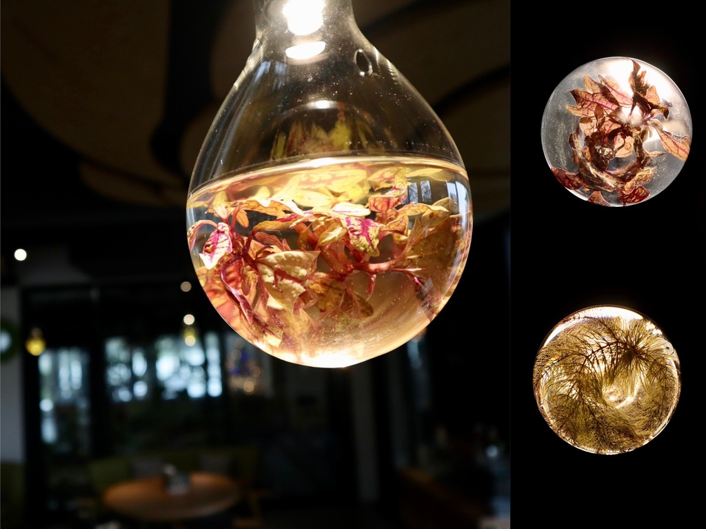 抬頭一看發現燈飾非常特別,看起來就像是不同的奇幻星球,仔細一看才發現原來燈飾裡放的是不同的水生植物,這樣的巧思真的令人驚喜又有創意,不自覺讓我欣賞了許久,瞬間忘情地像是遨遊了星際上的不同星球!