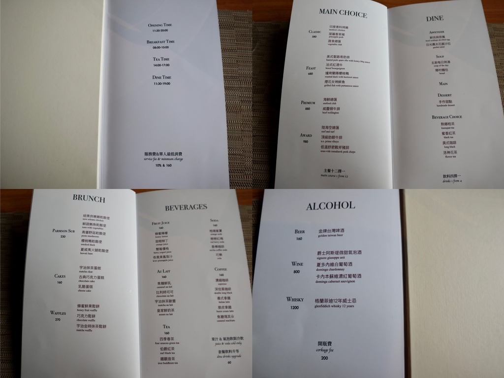 日光LOHERB主要是提供給房客用餐,餐廳部分也有對外營業,有主餐、早午餐及飲品,主餐部分有12種選擇,價位則有$580、$680、$880及$980,主食套餐另有提供前菜、湯品、甜點及茶飲。