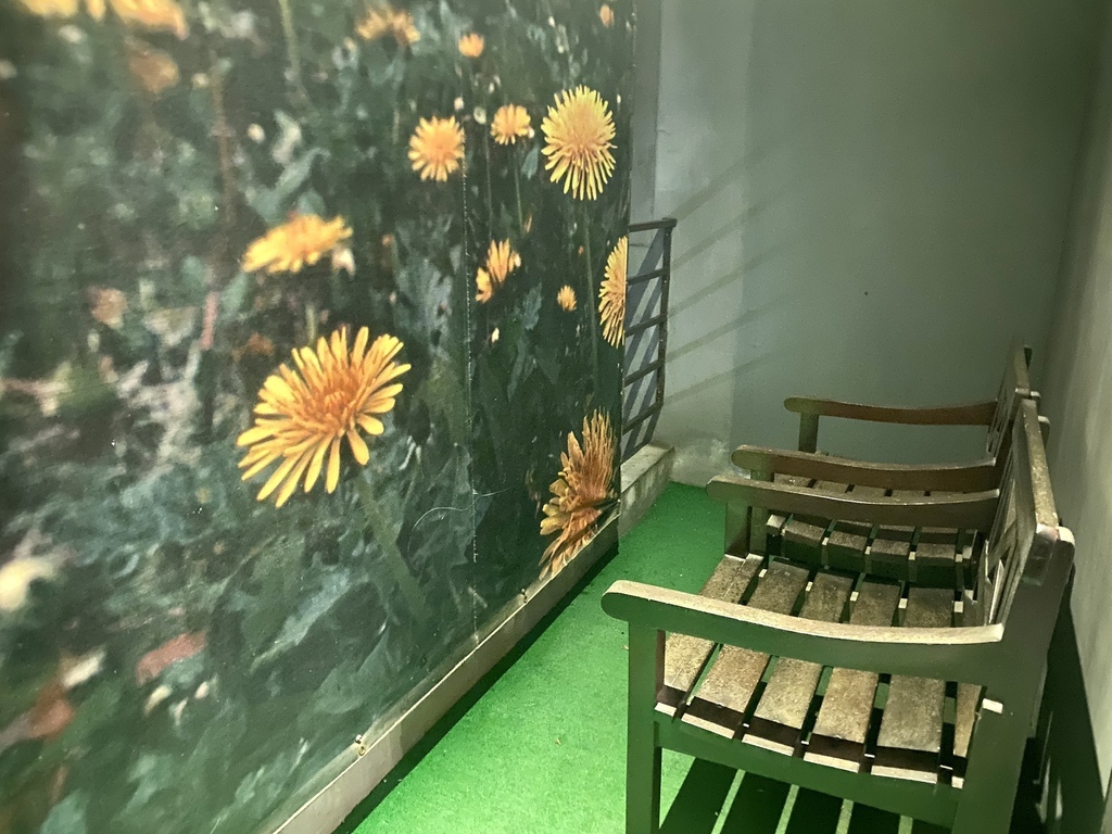 最後還發現浴室旁還發現有一處戶外小陽台,這裡是隱密的空間,所以大家也可以放心隱私性的問題,只是這樣小陽台的設計真的很妙,看著帆布上的菊花照片真的很有趣XD