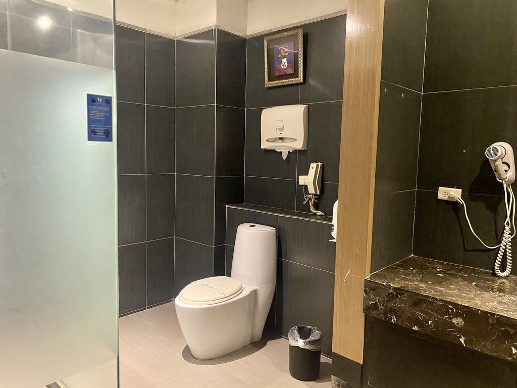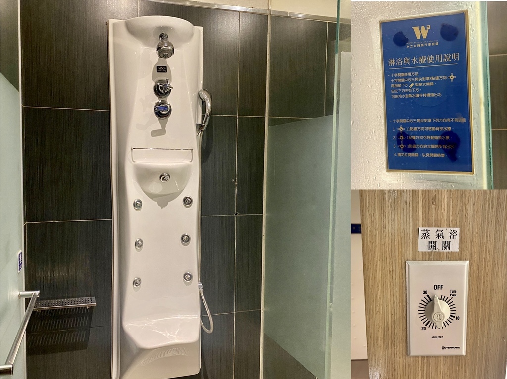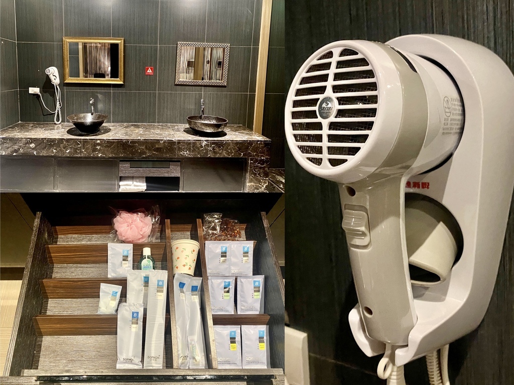 浴室設施很特別,竟設置了兩個面盆和化妝鏡,另有達新牌吹風機、沐浴用品及盥洗用品可以使用