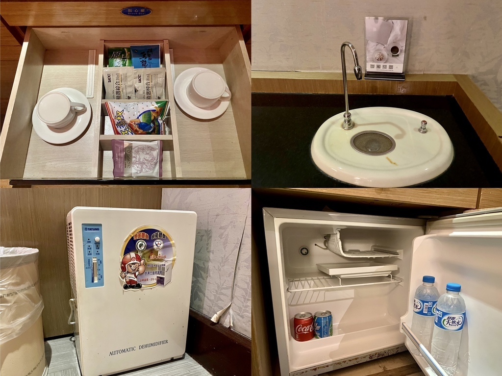 房內還有小冰箱、飲水機、除濕機、咖啡包、茶包、點心、飲料、礦泉水