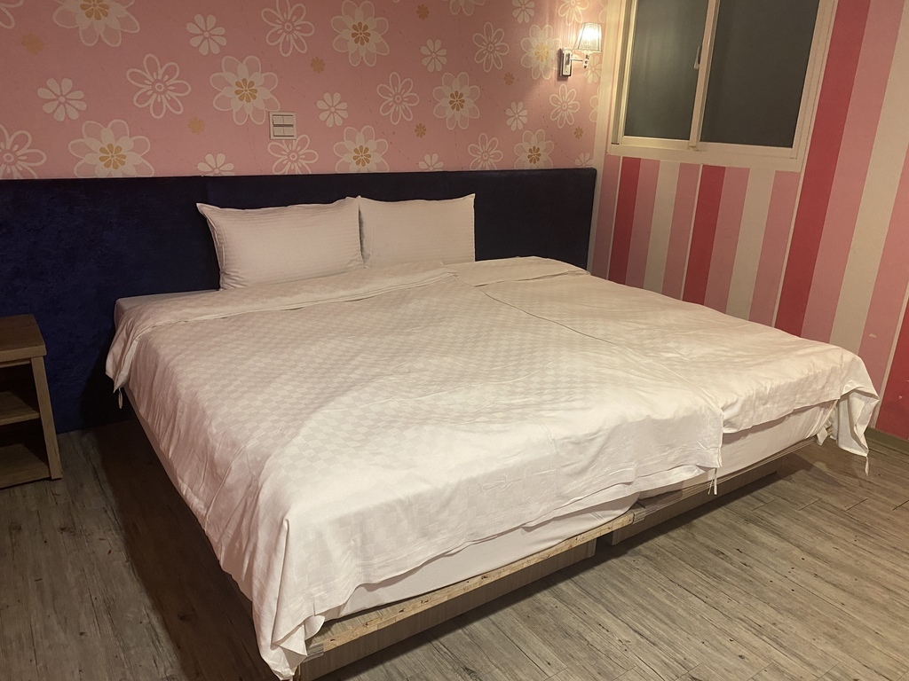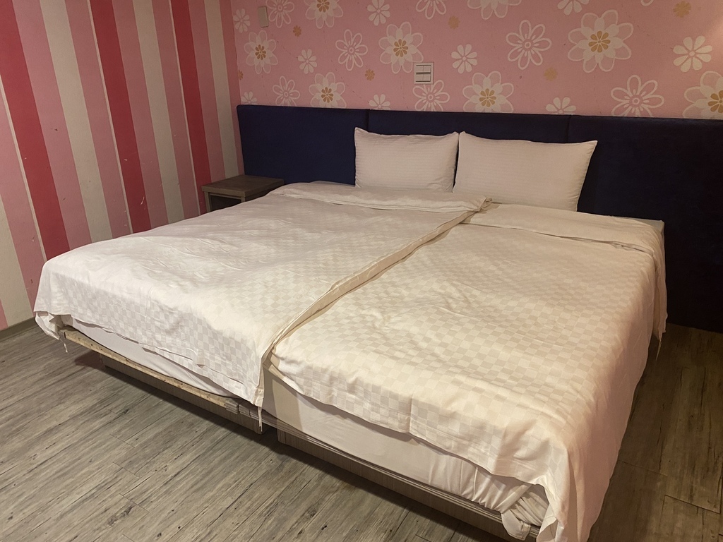 床的部份是兩張床拼接而成的,床單看起來是因為沒有適合的尺寸,所以這樣的疊放,看起來就默默又扣了一些分數..