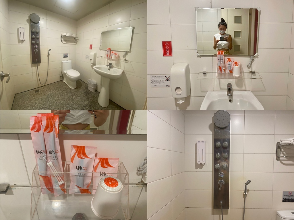 接著來看看衛浴設備吧,衛浴空間算大,有花灑及蓮蓬頭的水療設備,牆上有洗沐用品,面盆上方也有簡易的備品可以使用。