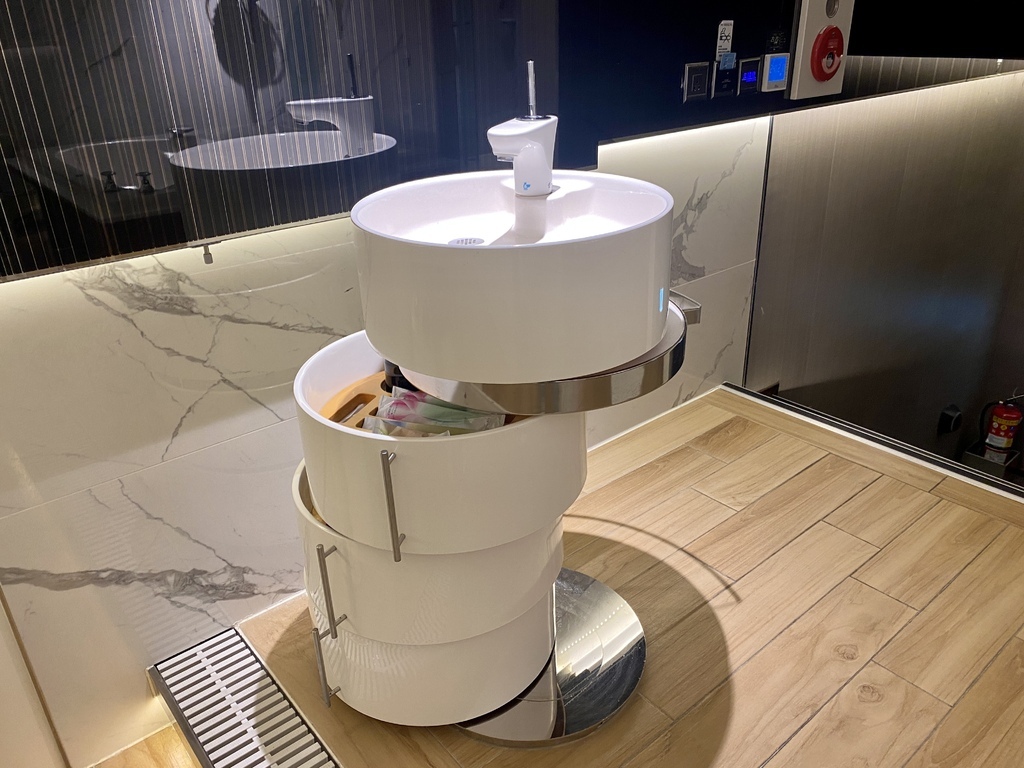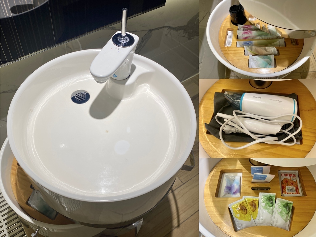 共有四層,由上至下是冷熱水的面盆、盥洗用品(牙刷牙膏組、刮鬍刀、棉花棒、香皂、梳子、造型夾、漱口杯)、沐浴用品(浴帽、洗髮精、沐浴乳、泡澡包)及Philips吹風機,使用體驗的唯一缺點就是漱口杯及牙刷實在沒地方放,這部分確實有些可惜。