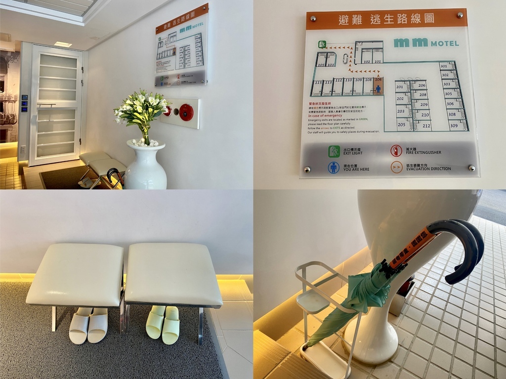 一樓有逃生路線圖,備有貼心的tiffany色雨傘及換鞋座位區,室內拖鞋也有質感,不是那種薄款的紙拖鞋