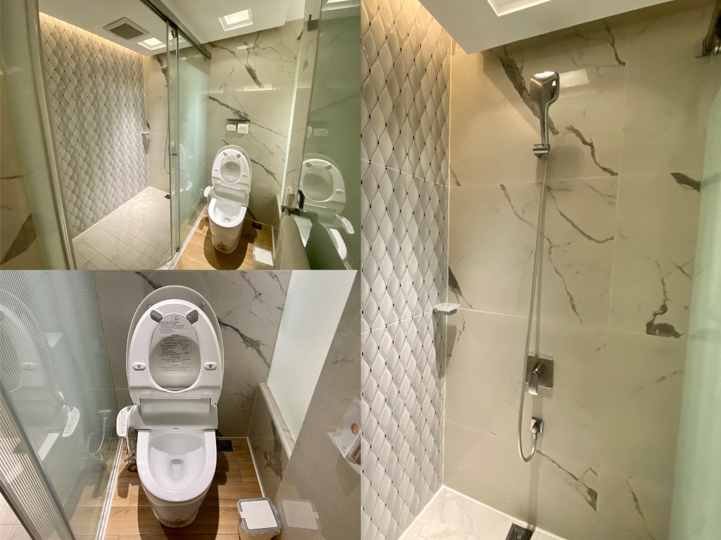 衛浴部分採乾濕分離,有透明的隔門設計,地板的部分我也很喜歡,不容易滑倒,而馬桶是使用國際牌免治馬桶喔!