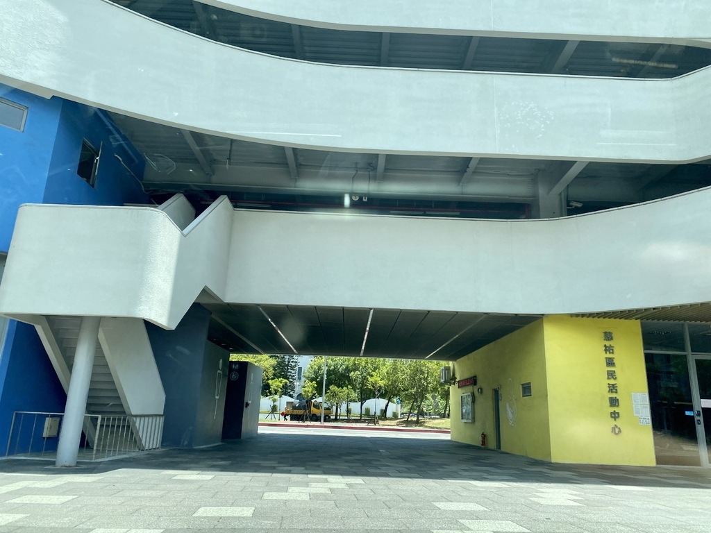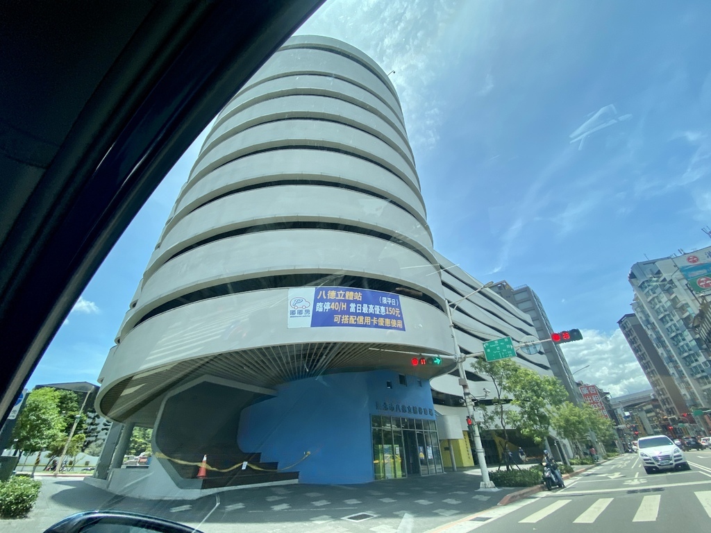 新型的八德立體停車場的外觀是圓柱狀的,看起來有很多層,很壯觀!