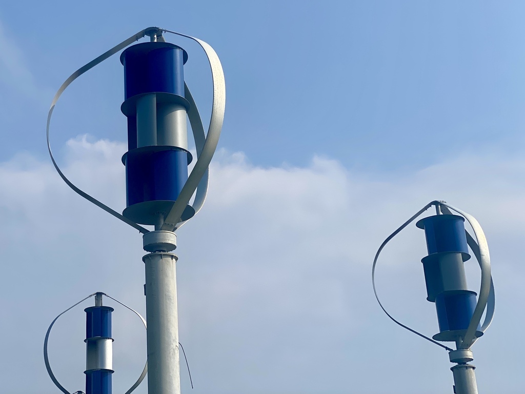 仔細放大一看發現它的外型真的很特別,以往印象中的風力發電是那種很巨大的三葉扇形大風車,這個風力發電機相對而言較小座,造型也很特別,也是我第一次看到有這樣造型的風力發電機,外觀有像是金屬的三片葉,中間則是藍白配色的柱狀設計,若是風夠大,可以稍微看到它轉動的模樣,看起來確實真的好像打蛋器啊!