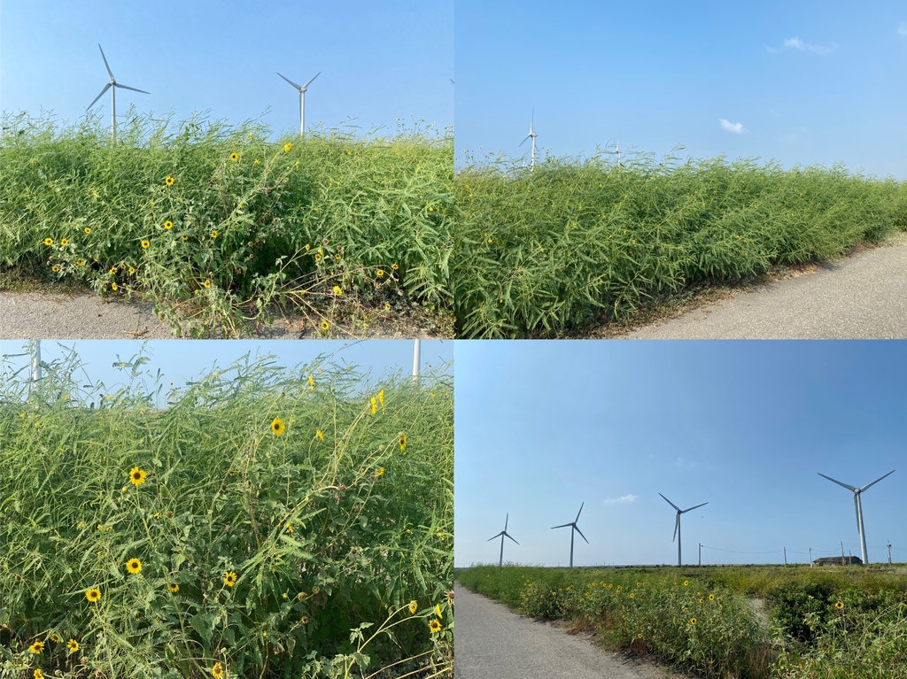 一旁有許多這樣的小黃花,對應後方我所常見的大型風力發電機,也算是特別的視角