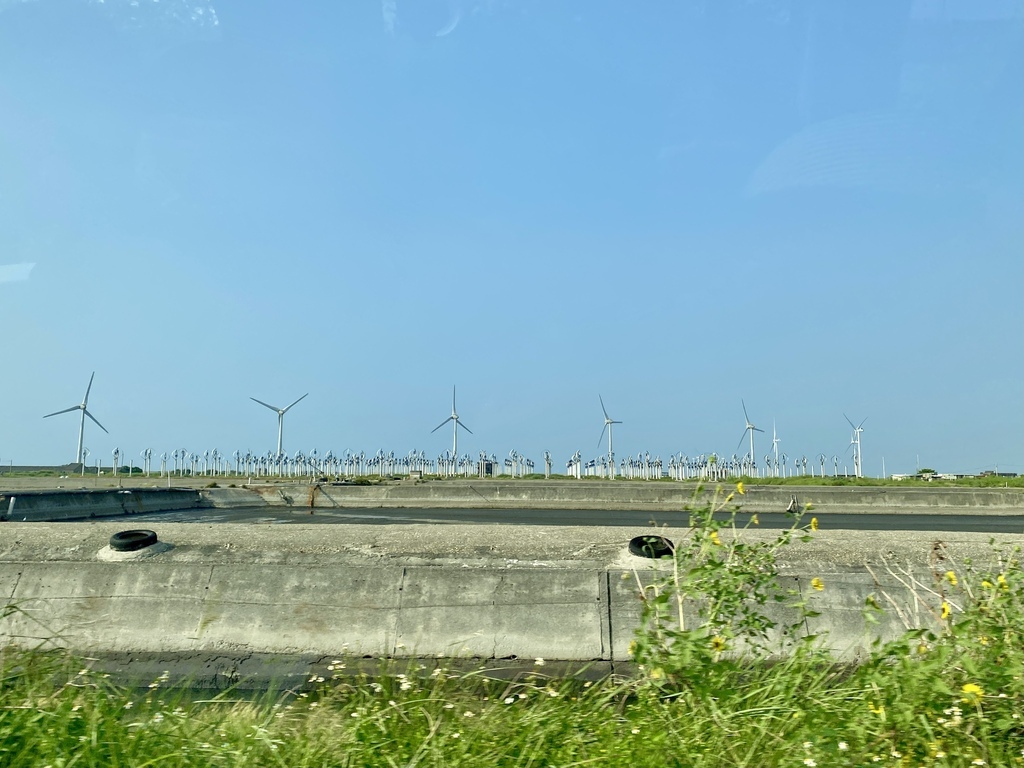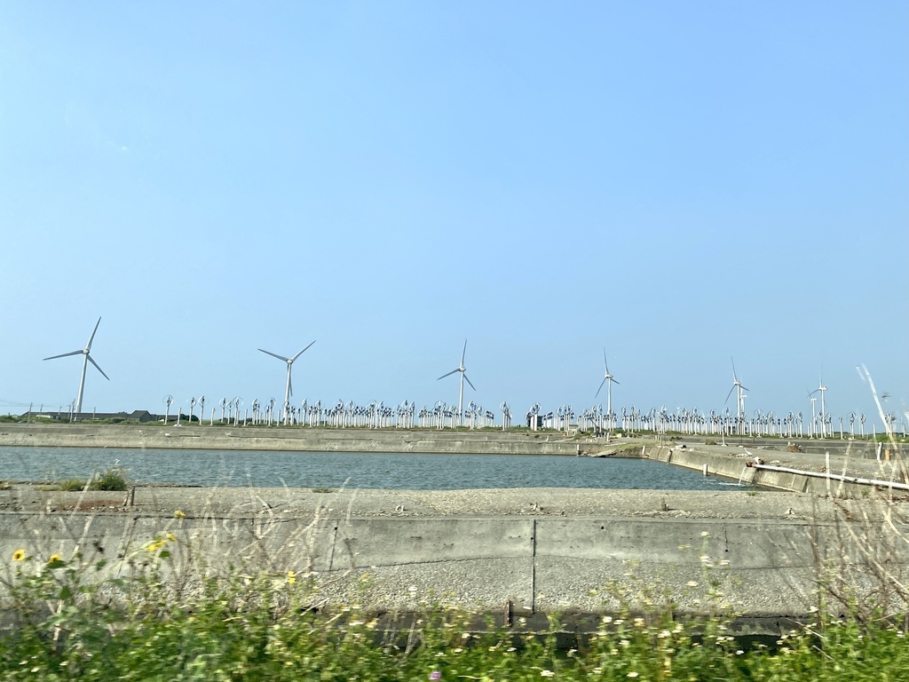 附近便是一池一池的魚塭,開車經過田間小路很有鄉村風情,沒多久便看到整片的風車林,非常壯觀!