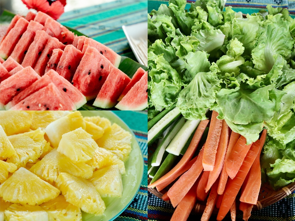 下午茶有準備許多茶飲及新鮮的蔬果和美食,有許多蔬菜都是自己種的喔!