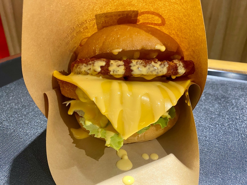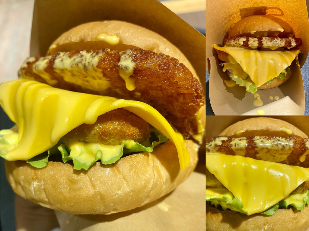 漢堡皮烤得很飽滿,不會像是有些漢堡一上桌時就呈現壓扁的樣貌,因此看起來特別可口,中間的夾層分別是薯餅、起司片、素排及生菜,外面再淋上一層黃金芥末醬汁,整體看來的賣相很不錯!