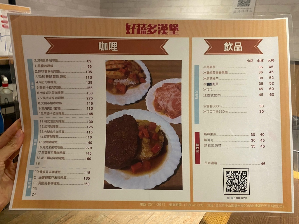 接著來看看好蔬多漢堡的菜單,下圖有主食咖哩區,光是咖哩就多達22種,另外還有以三種素別(全素、奶素、蛋奶素)做分類