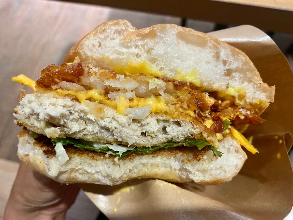 咬了一半的漢堡橫切面,可以看出內容物真的蠻豐富的,尤其是那薯餅真的炸得很酥脆,吃了好罪惡啊!