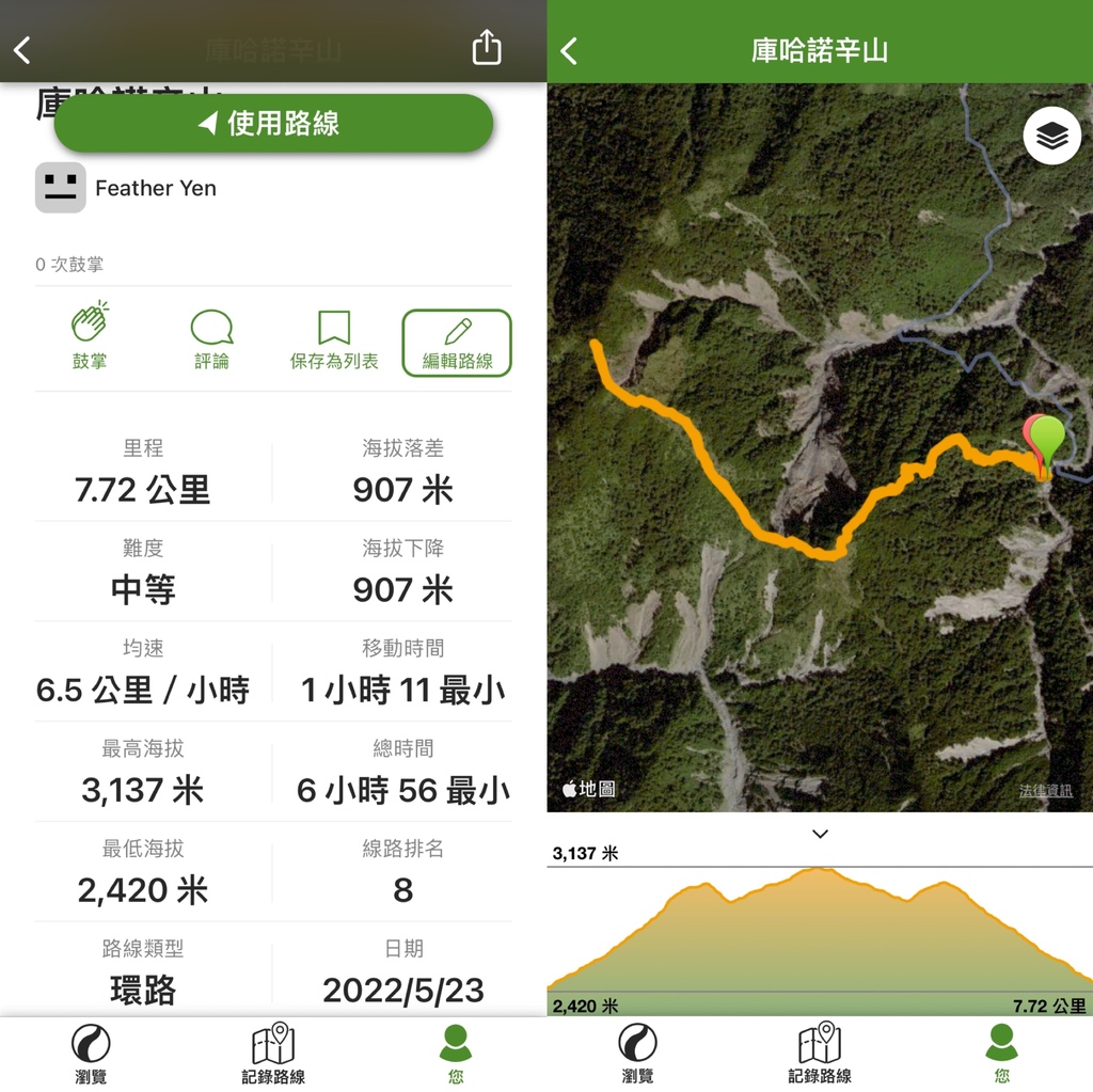 我這次是使用手機APP「Wikiloc」及「健行筆記」做紀錄的,兩者數據會有些微差距,也放在以下給大家參考。