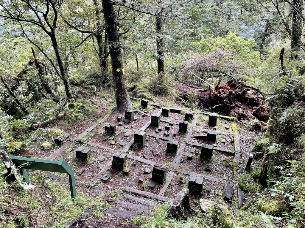 抵達0.6K處,翻越一處大斷木後,有一個小平台,這裡沒有任何介紹牌,但其實這裡便是舊時的駐在所遺跡,若稍微往上走回頭鳥瞰,則會發現這平台共有16個木樁喔!