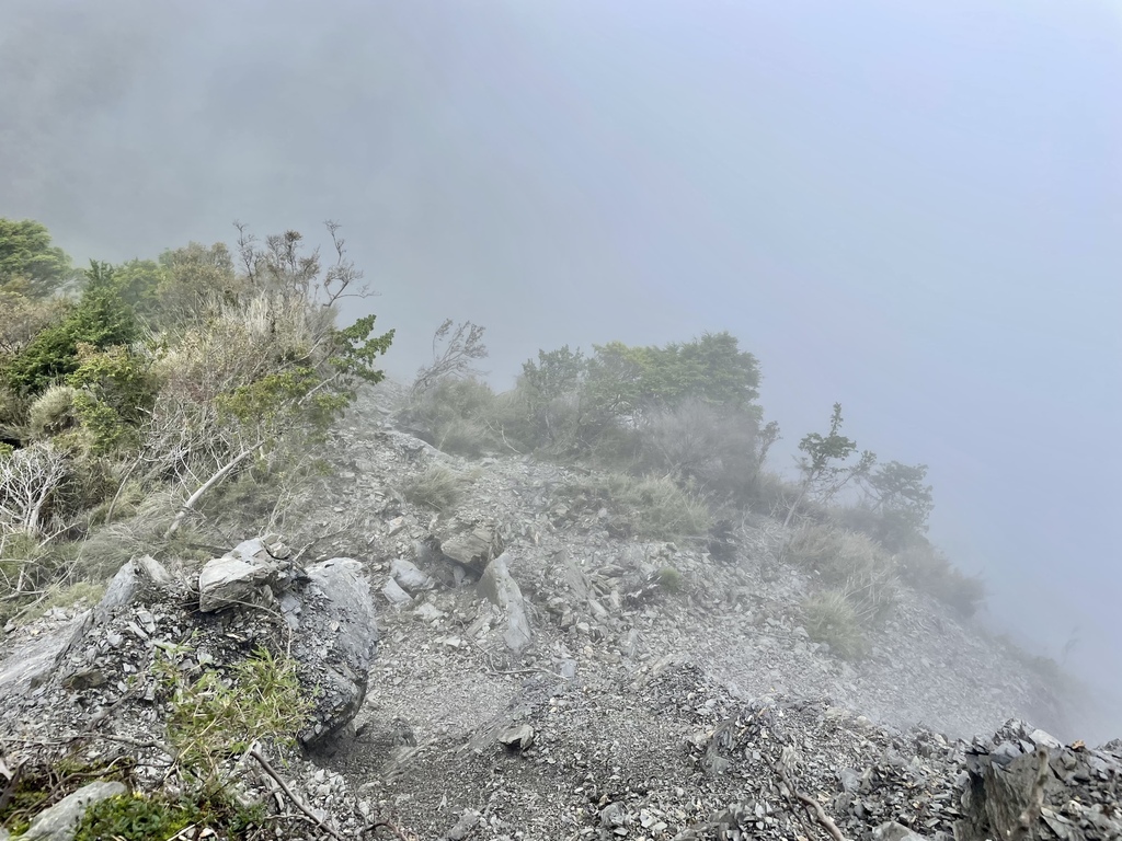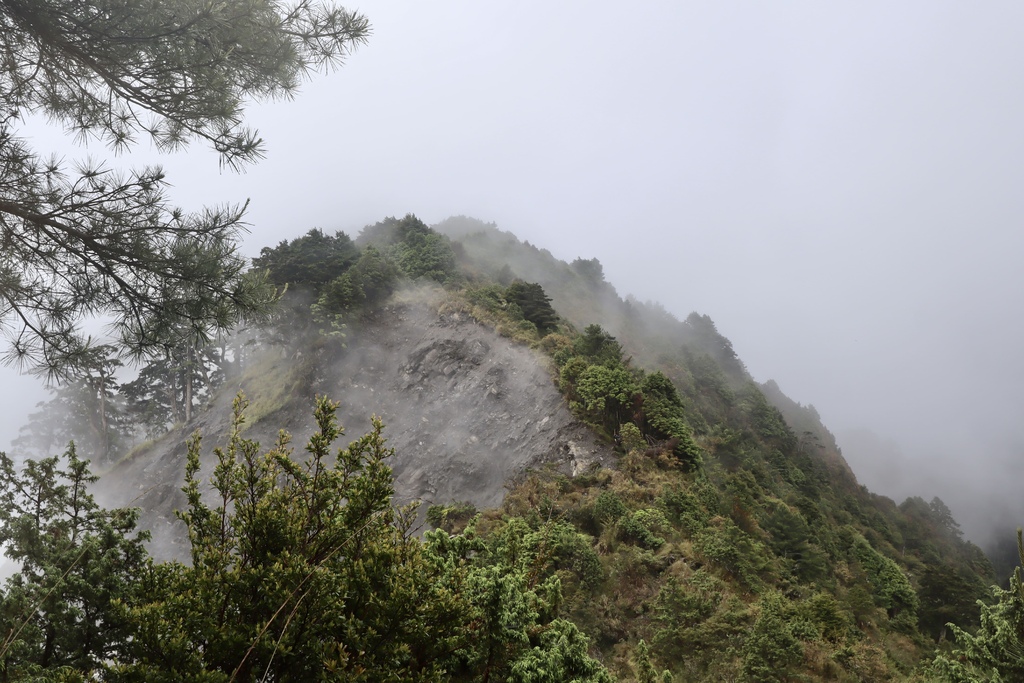 接下來的路線一旁就是大崩壁,因為起霧的關係,眼前的能見度變得很低,此時不知該不該慶幸此時看不清楚崩壁的畫面,我想若視野不錯,懼高的朋友或許要倒抽一口氣了呢!