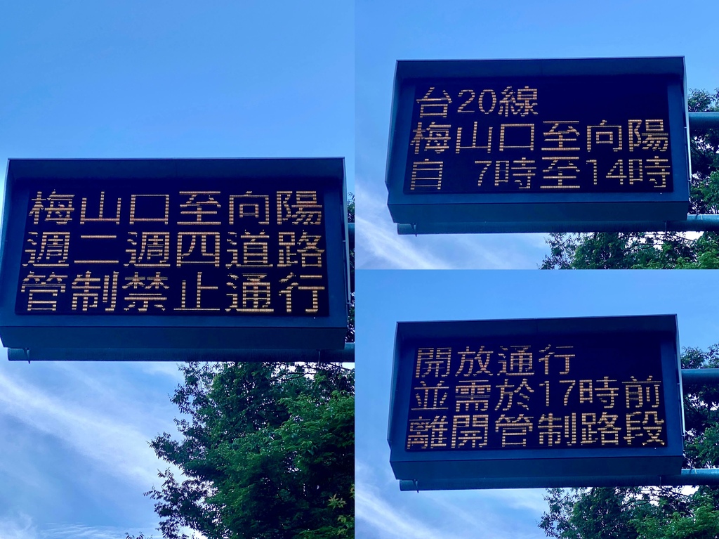 1.梅山口至向陽路段:週二、週四道路管制禁止通行