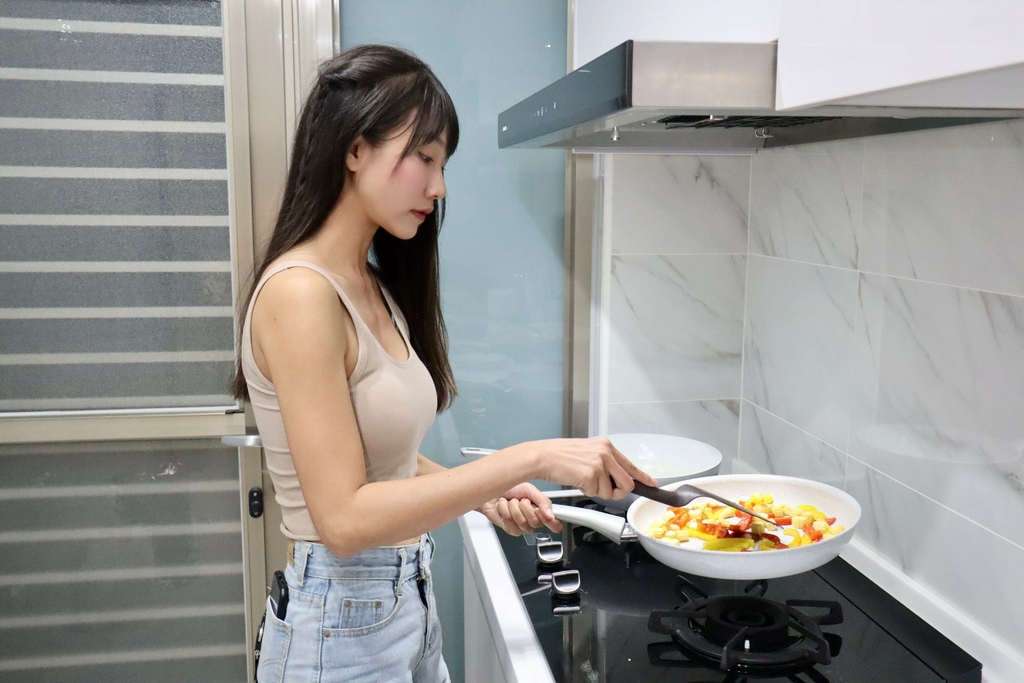 料理中Tips:使用保護陶瓷塗層的耐熱膠鏟或是木鏟,可以避免刮傷受損,使用時加少許食用油料理,維持中火作烹飪。