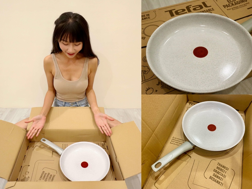 陶瓷鍋底部是用不殘膠直接黏在紙板上,輕輕摳取便能輕鬆去除,兩個鍋具都是這樣淺色系的白色,不得不說法國特福這次推出的這配色真的很時尚討喜啊!