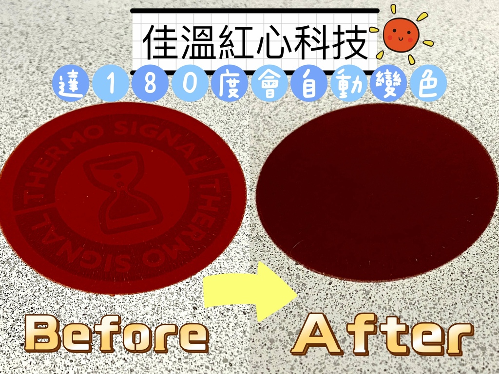 原來這就是法國特福的「佳溫紅心科技」,只要鍋具達溫度180度,正中央的佳溫紅心便會自動變色,如下圖左至右的顏色變化,從鮮紅色變成暗紅色,當看到變色後,就表示可以開始烹煮料理。