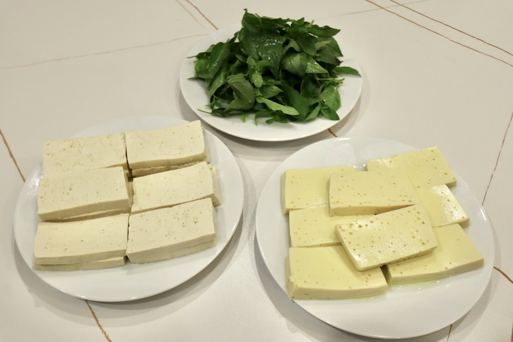 準備的食材有:板豆腐、雞蛋豆腐、九層塔、白芝麻、橄欖油、素蠔油、水