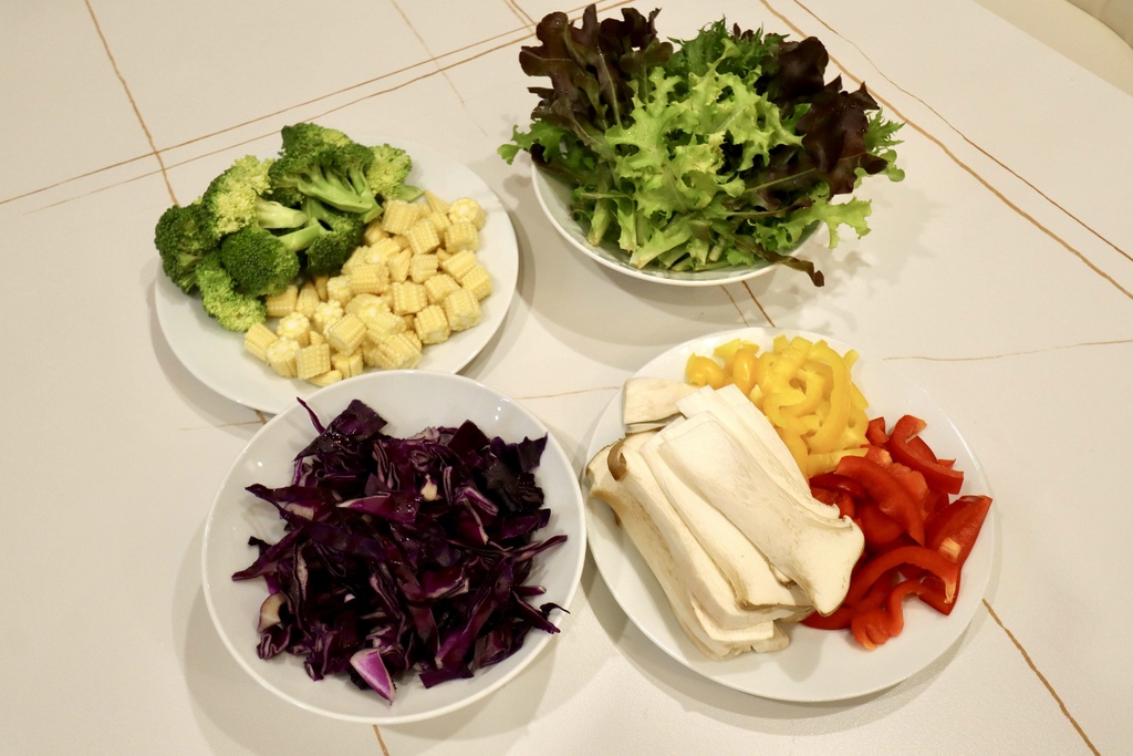 需要準備的食材有:各式生菜、花椰菜、玉米筍、紫甘藍、杏鮑菇、紅椒、黃椒、橄欖油、素食沙拉醬