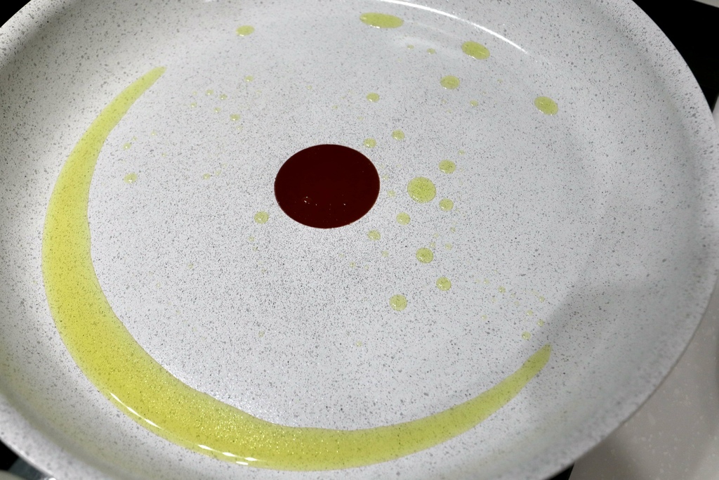 開火後發現中間的紅點開始漸漸呈現暗紅色,這就是法國特福的「佳溫紅心科技」,正就表示溫度已達180度,是最佳的黃金下鍋時機
