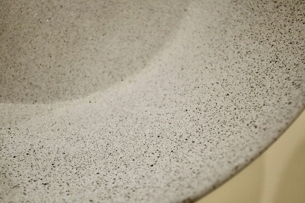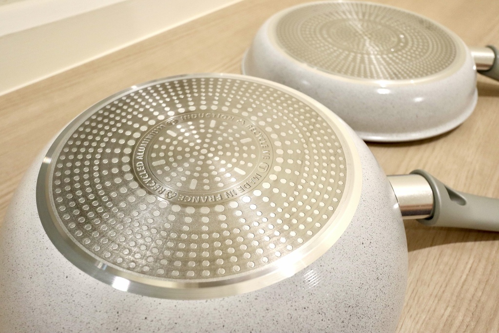 特福的綠能陶瓷鍋是使用源自大自然的「安心陶瓷塗層」,鍋子摸起來的質地很光滑,仔細一看會發現鍋具上面有一點一點的小灰黑點,看裡來是很特別的花紋,由於綠能陶瓷鍋是100%循環再製鍋身,因此每一個陶瓷鍋上的自然花紋都是獨一無二的喔!