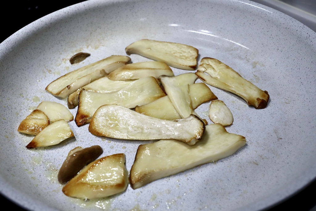 既然是溫沙拉,所以有幾樣食材我有挑選先開火做烹煮,首先我是先將事先切好的杏鮑菇,加橄欖油下鍋乾煎,煎至食材稍微出水即可