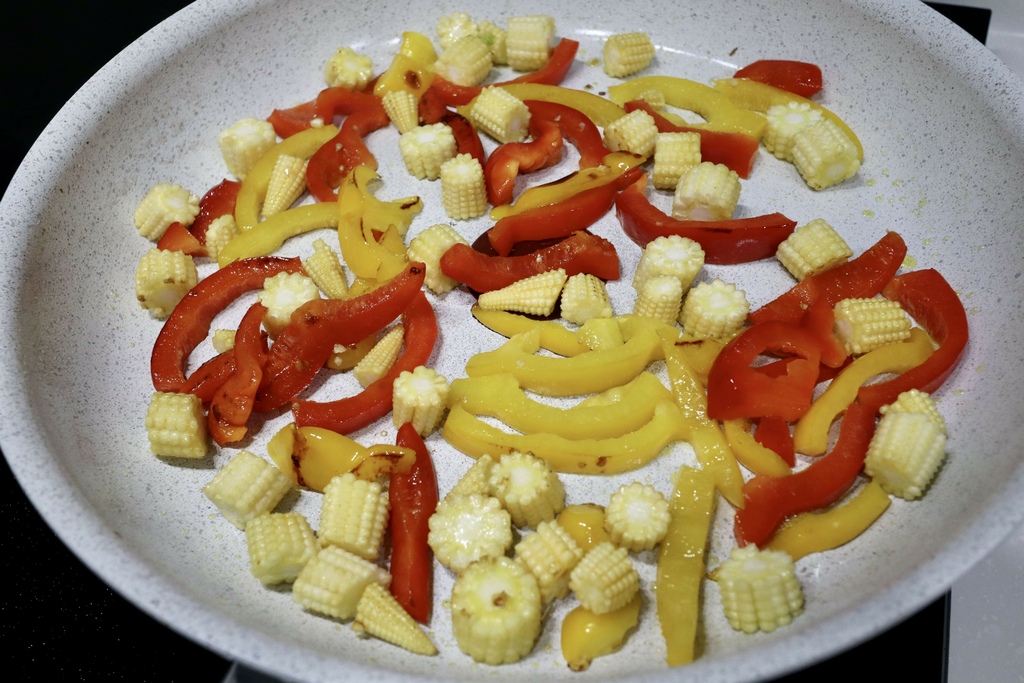 接著換甜椒及玉米筍,只需簡單的拌炒,不需要太久的時間