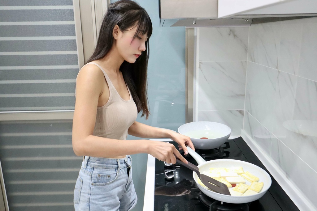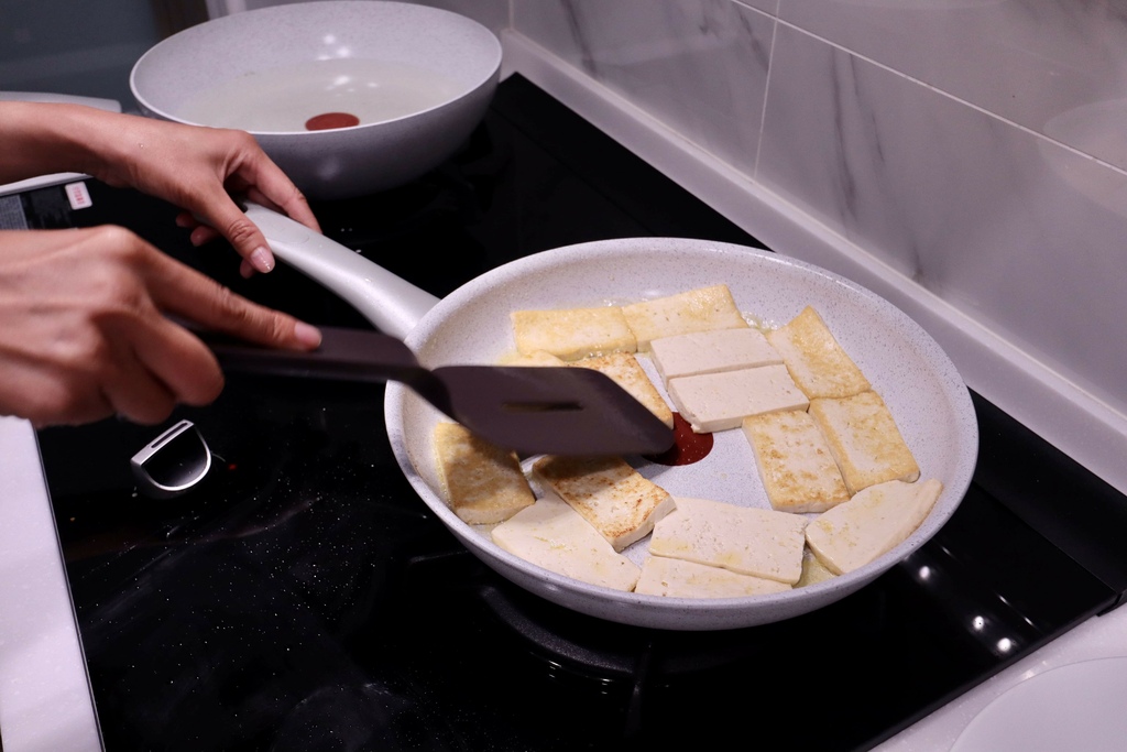 我覺得煎豆腐真的很考驗鍋具好壞,一般的鍋具很多都會跟食材黏在一起,食材常因此破碎不完整,但特福綠能陶瓷鍋的不沾效果很厲害,軟嫩的豆腐即便多次翻面煎都可以完好如初。