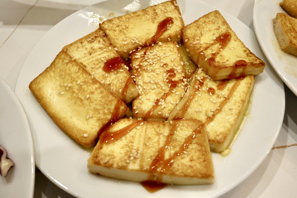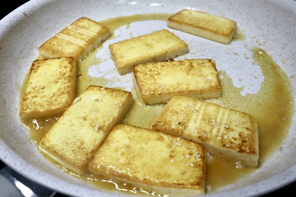 一樣將雞蛋豆腐切片狀後下鍋,雙面煎至金黃後下醬汁,等待收乾後再關火灑上白芝麻增添香氣。