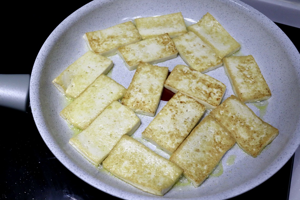 首先,先將板豆腐切成片狀,下橄欖油熱鍋,等待佳溫紅心變色後,就可以把板豆腐直接放入特福陶瓷鍋中,煎至金黃後即可翻面。